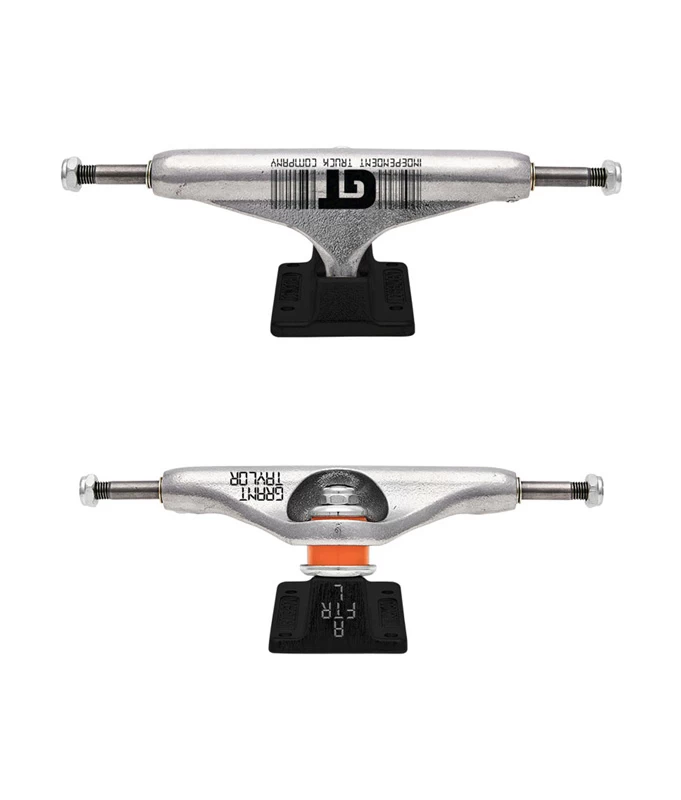 Independent Trucks Grant Taylor Pro Stage 11 Hollow features polished silver hanger with GT pad prints front and back, flat black powder coated baseplate with laser etched logo on rear kingpin housing, classic orange cushions, and silver hardware.