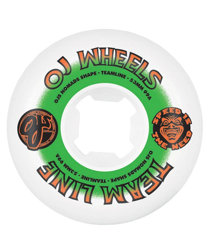 OJ Wheels new 53mm Team Line Nomad with classic inspired graphics and Team Line 99a urethane in a natural white color.