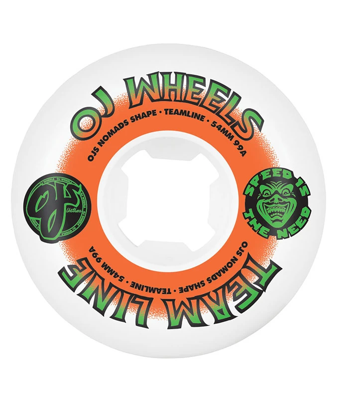OJ Wheels new 54mm Team Line Nomad with classic inspired graphics and Team Line 99a urethane in a natural white color.
