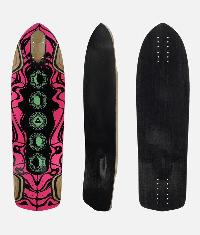 The Andy Atch Pro started out as the Seed deck until we decided to slim it down for Andy’s pro model “Tortuga.” This is the same board with an updated construction to make the deck significantly more affordable at no loss of riding prowess. Conceptually speaking, the deck features very sexy, smooth lines, and we wanted this board to just look awesome underfoot. The board’s technical elements really center around the rear foot interface. The concept of a wedged tail stems originally from slalom decks. This has been done before, but what’s totally fresh here is the W bubble that we placed into the tail crease. This is not only a wood-bending feat, but it’s also an incredible interface for board feel. The rest of the deck is an extension of this tail interface, providing 3 mounting options up front so that once you’ve set up the rear of the deck to your liking, you can place your front truck where your tuck falls into the concave.
