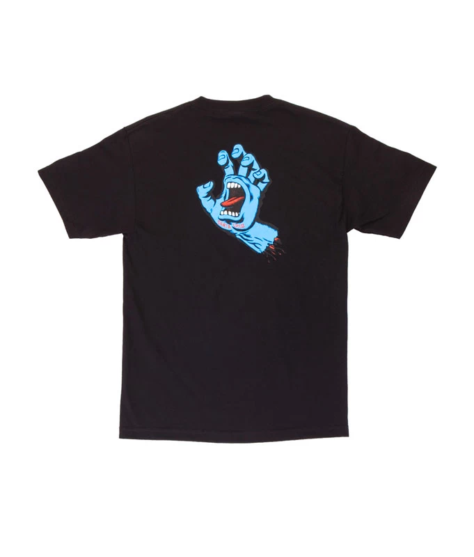 Santa Cruz Screaming Hand Backprint T-Shirt, in black. Available in size S, M, L, XL. Regular fit 6 oz. jersey t-shirt with small front print, large back print.