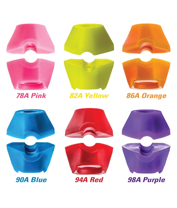 Available in six (6) color-coded hardnesses, including NEW 78A pink and 82A yellow.