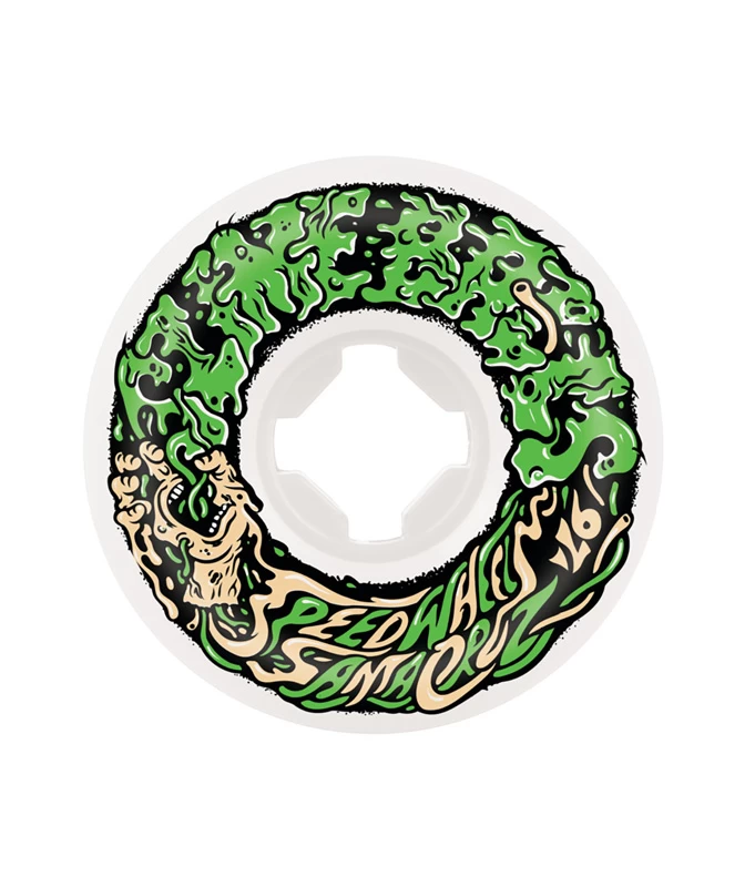 Slimeballs Vomit Mini wheels featuring art by FALU @falucarolei on wide asymmetrical shape with a rounded edge on one side and a conical edge on the other giving you a choice of lock in feel, with a wide riding surface for control on all terrain.